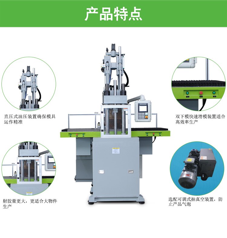 直壓式油壓機平衡裝置抓好塑模管理精準脫貧,  雙下方案速滑模傳動裝置時候高效性率出產,  射膠量大,更是和大東西產量,  選用能自由調節式抽渦流系統設計,放置從導致氣泡。