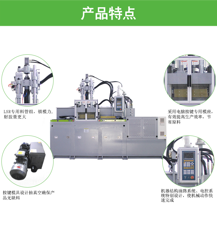 200噸液態硅膠按鍵射出成型機,廣泛應用于電子產品、各類按鍵、鍵盤保護膜、汽配用品等,特點包括:1、LSR專用料管組,鎖模力、射膠量更大;2、機器結構油路系統、電控系統特別設計,使機械動作快速完成。